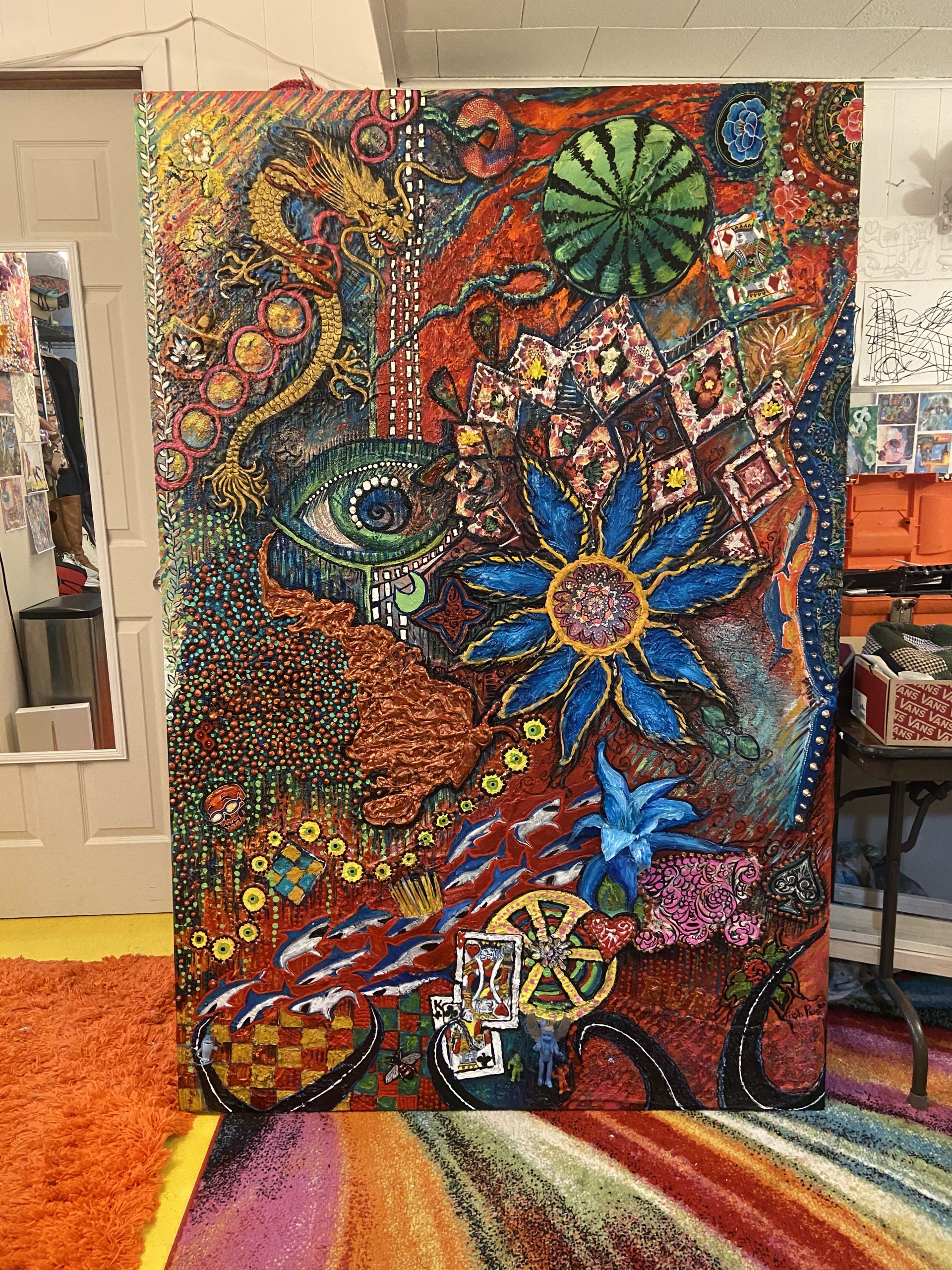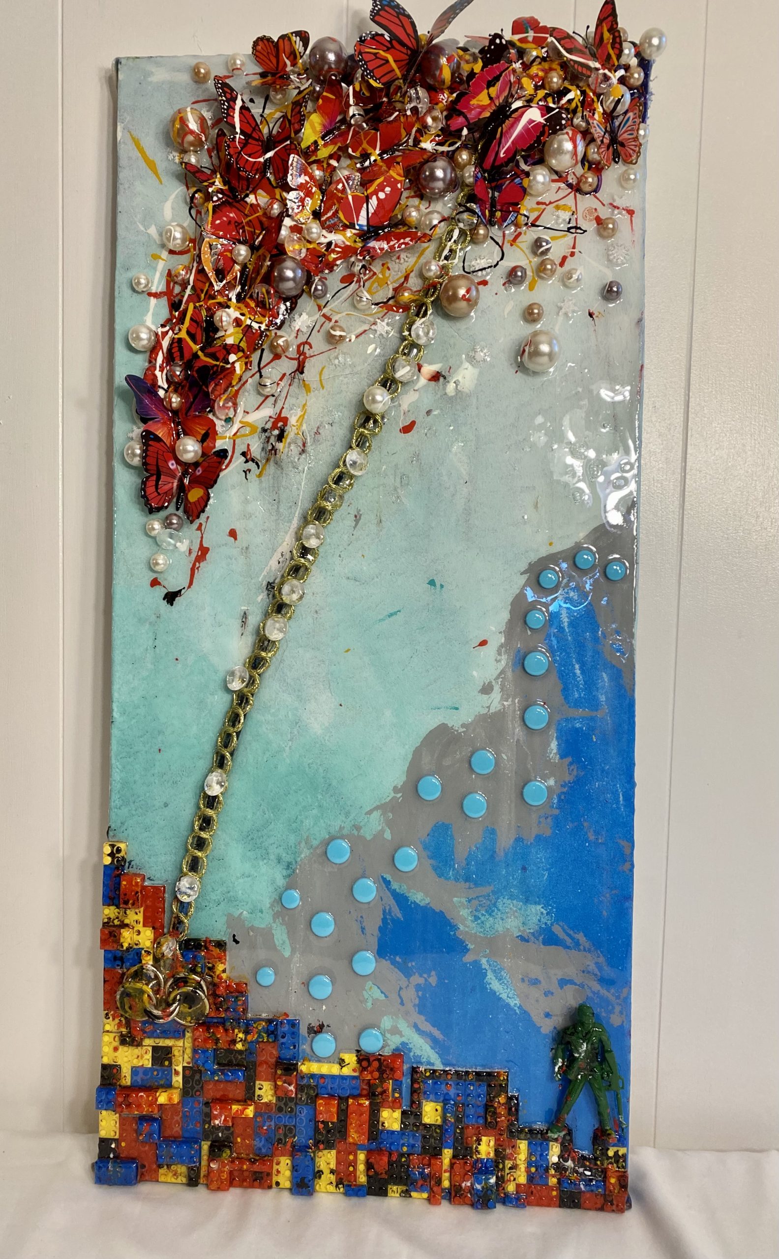 How much kid art do you have laying around? Or possibly medals from sporting events, ribbons, patches, old report cards, even old uniforms from gymnastics. Their favorite tiny toy from that time you got them a Happy Meal only to step on it with your bare feet. How about turning all of those memories into a custom mixed medium abstract painting? I will interview you and your child, ask the right questions, discover your favorite things and I will do the rest! Give me all the stuff. I will mount on quality plywood and add my artistic flair. Proudly hang it anywhere in your home or office.